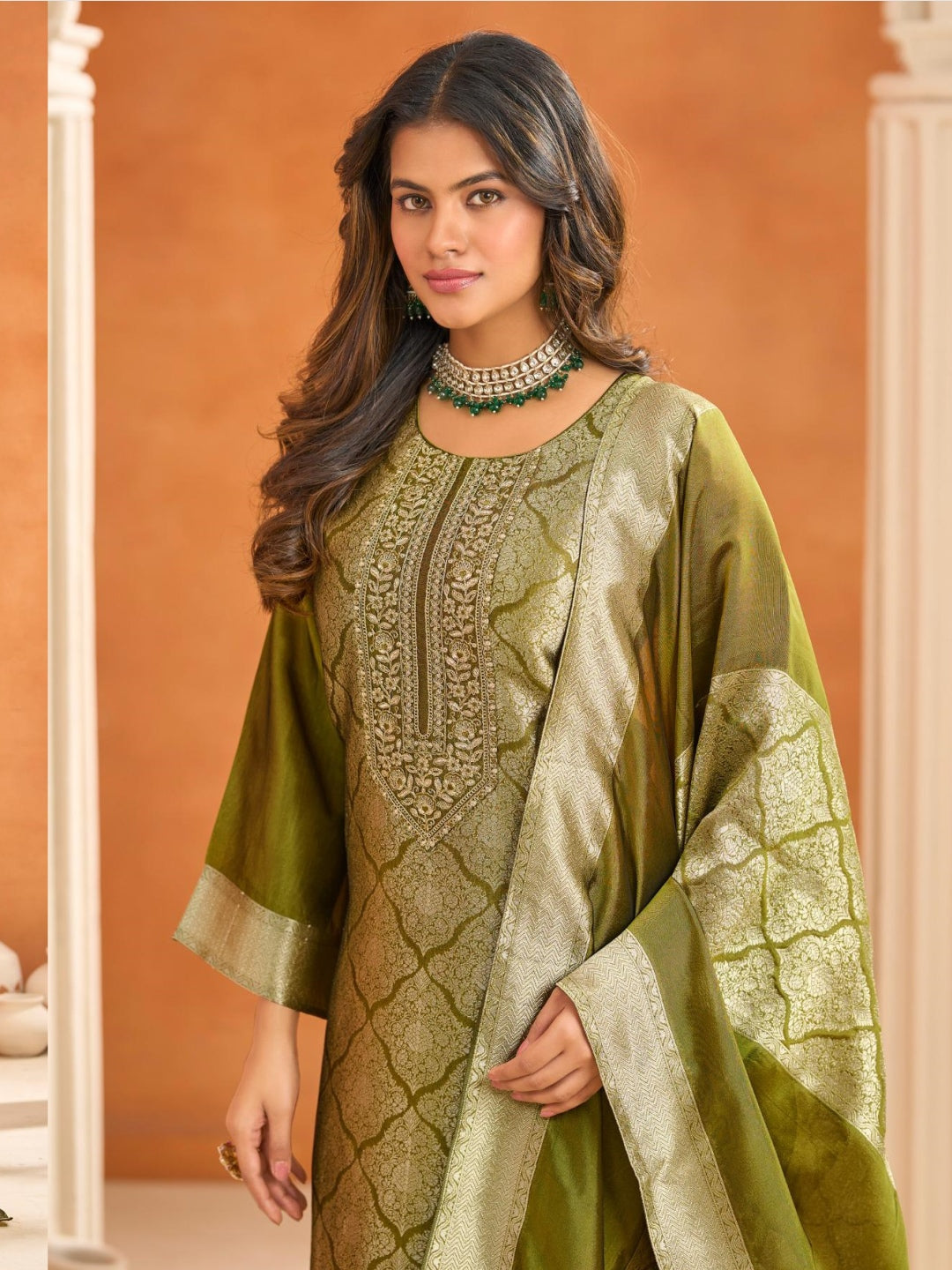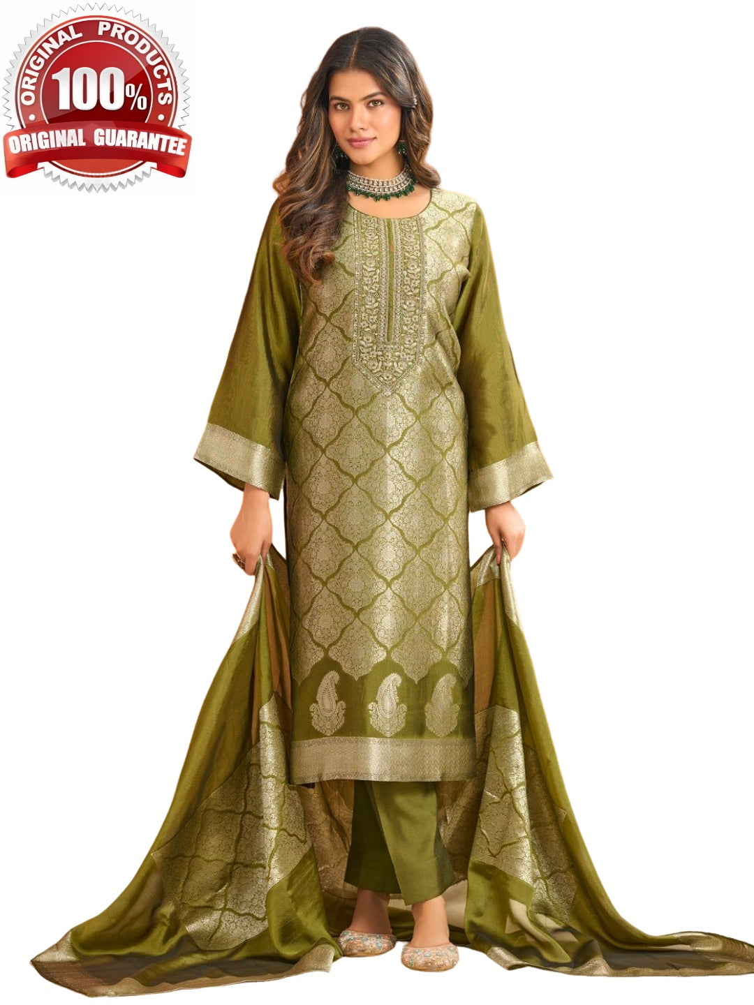 • Dupatta (Shawl): Elegant woven dupatta with soft sheen and rich border accents