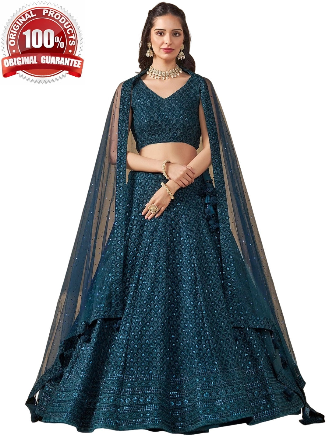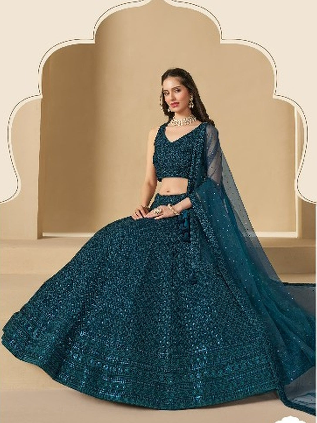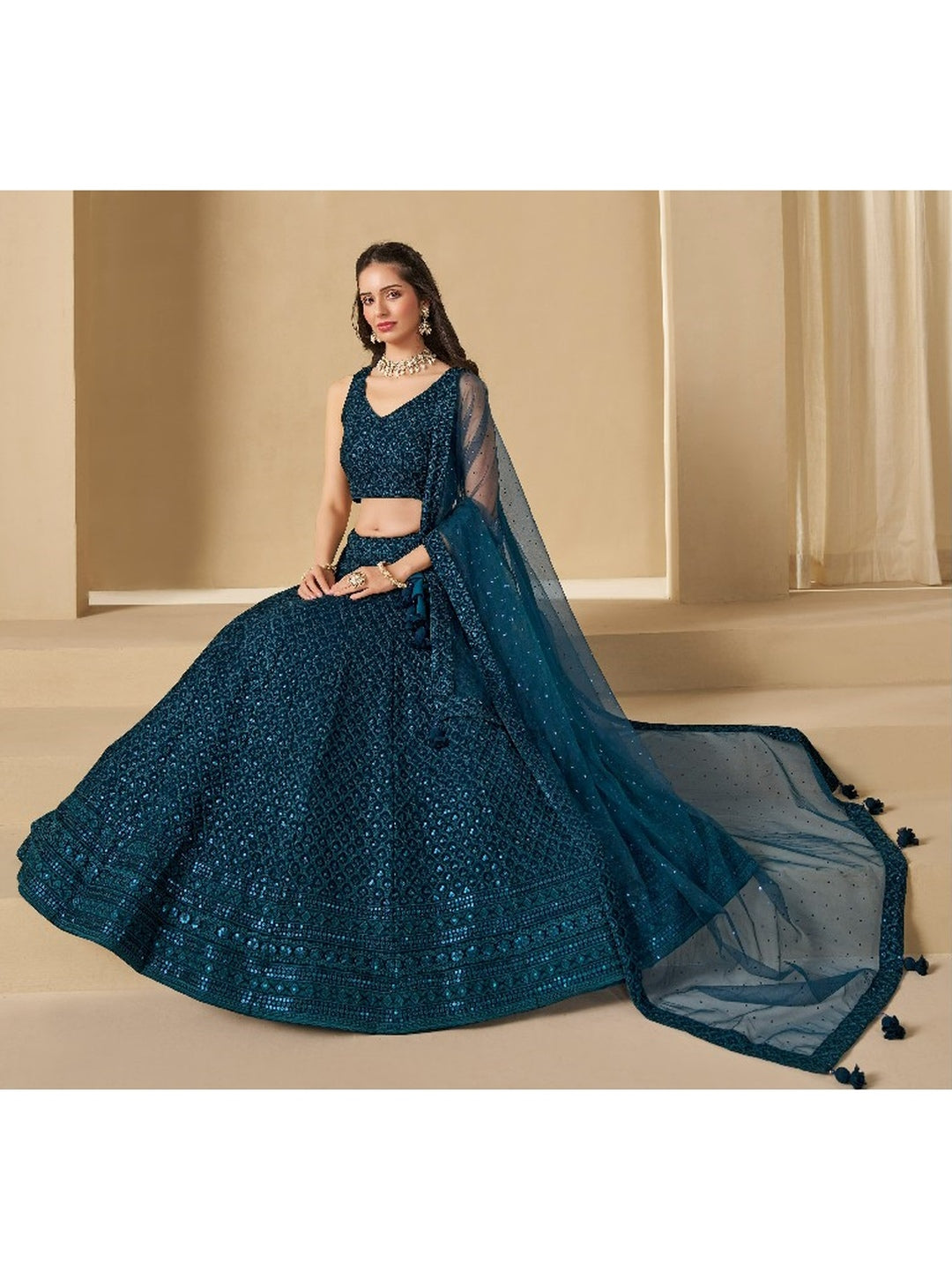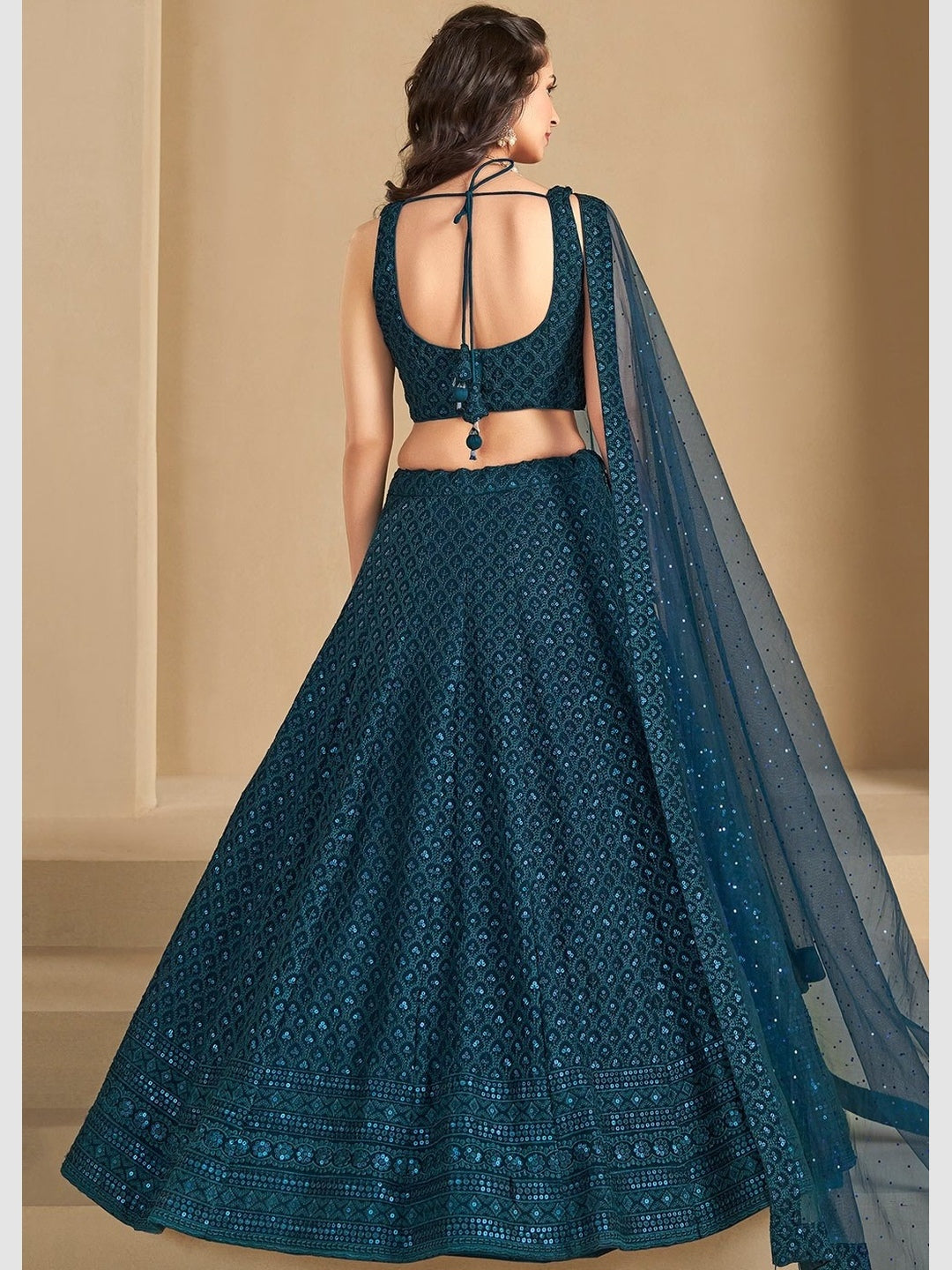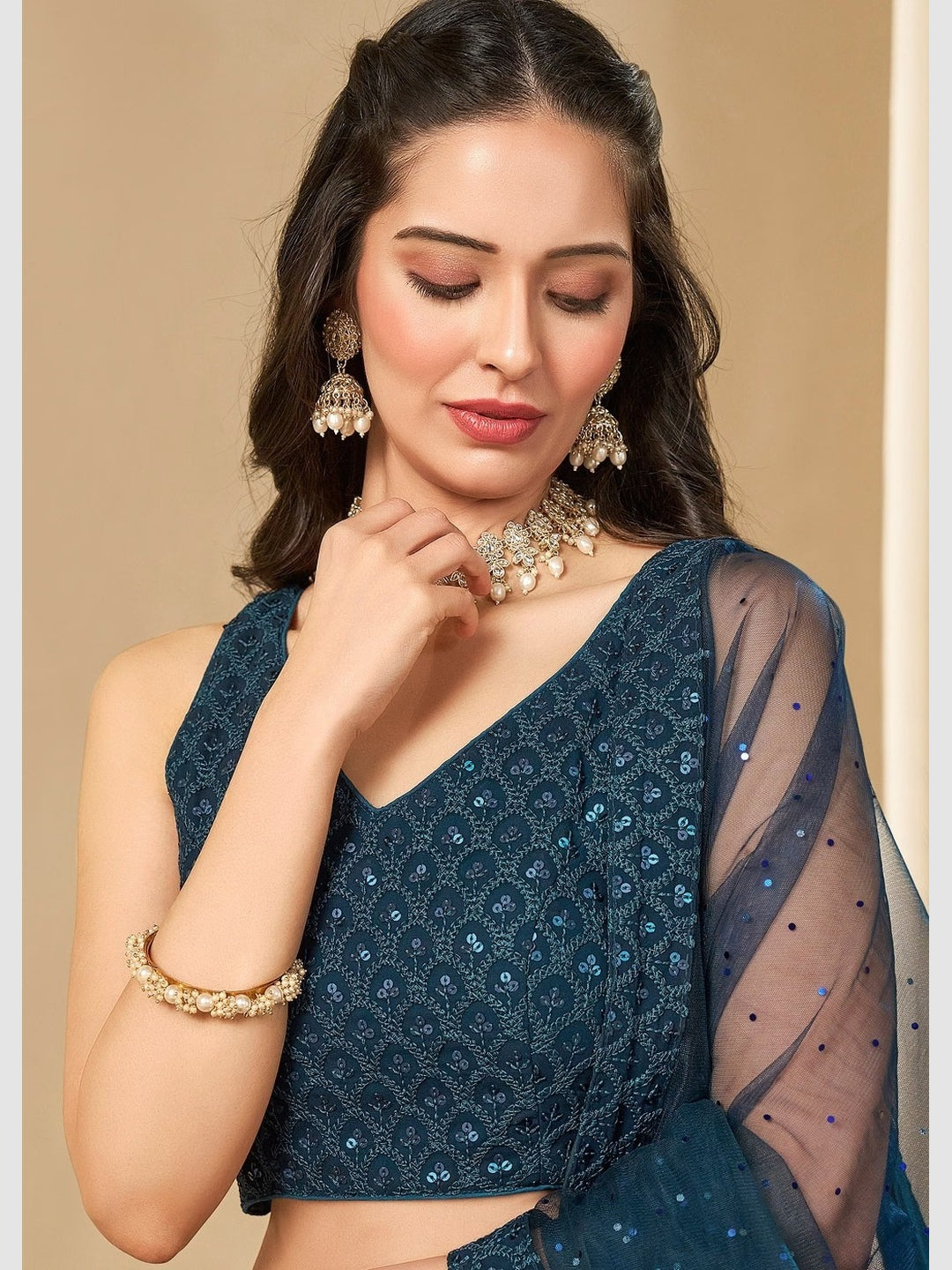 Teal Blue Sequins Embroidered Flowy Elegant Festive Wear Lehenga Choli